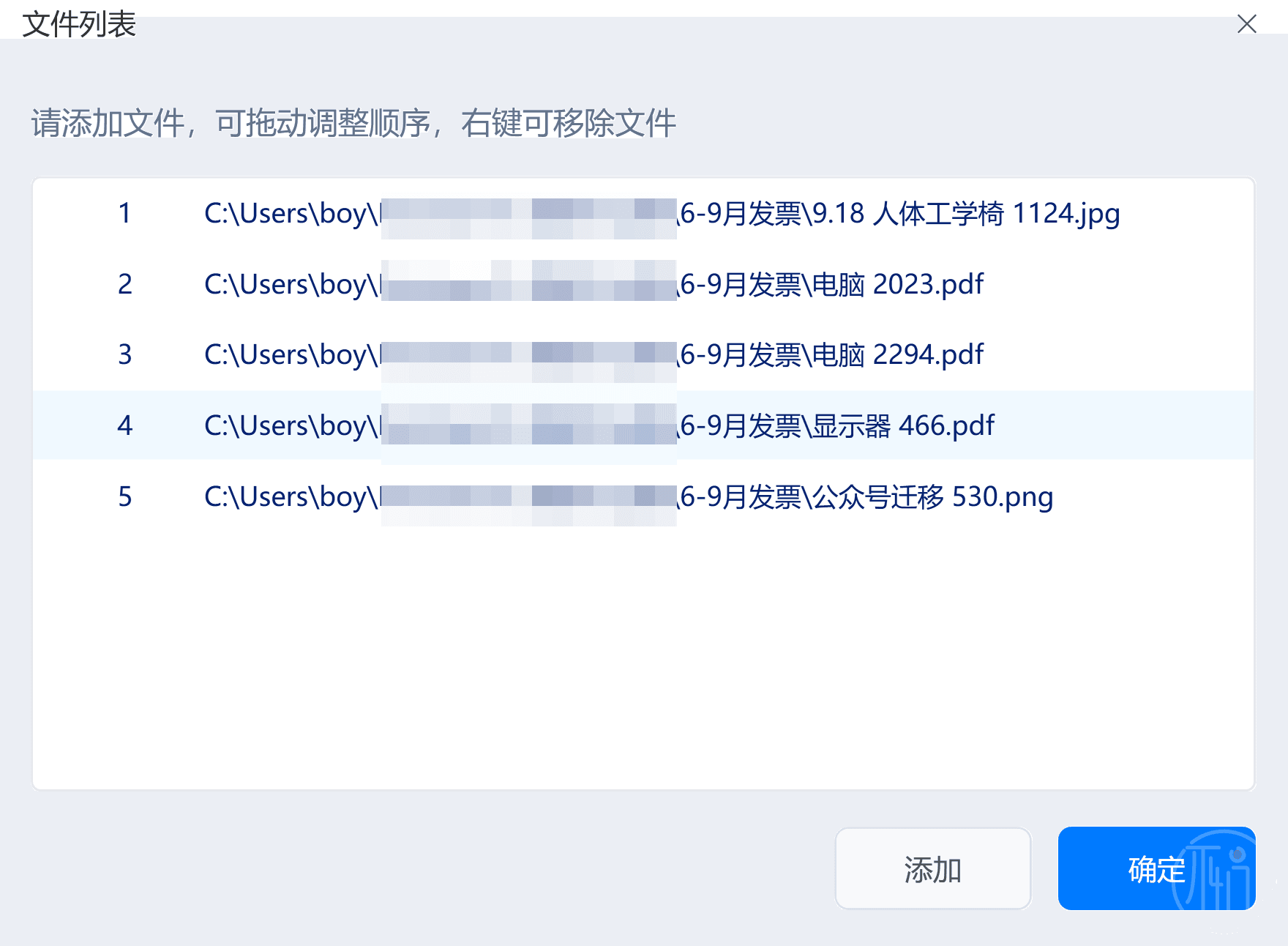 点击按钮后,选择发票后,可以在组织文件的窗口调整发票的顺序,后序AI会按顺序挨个识别。